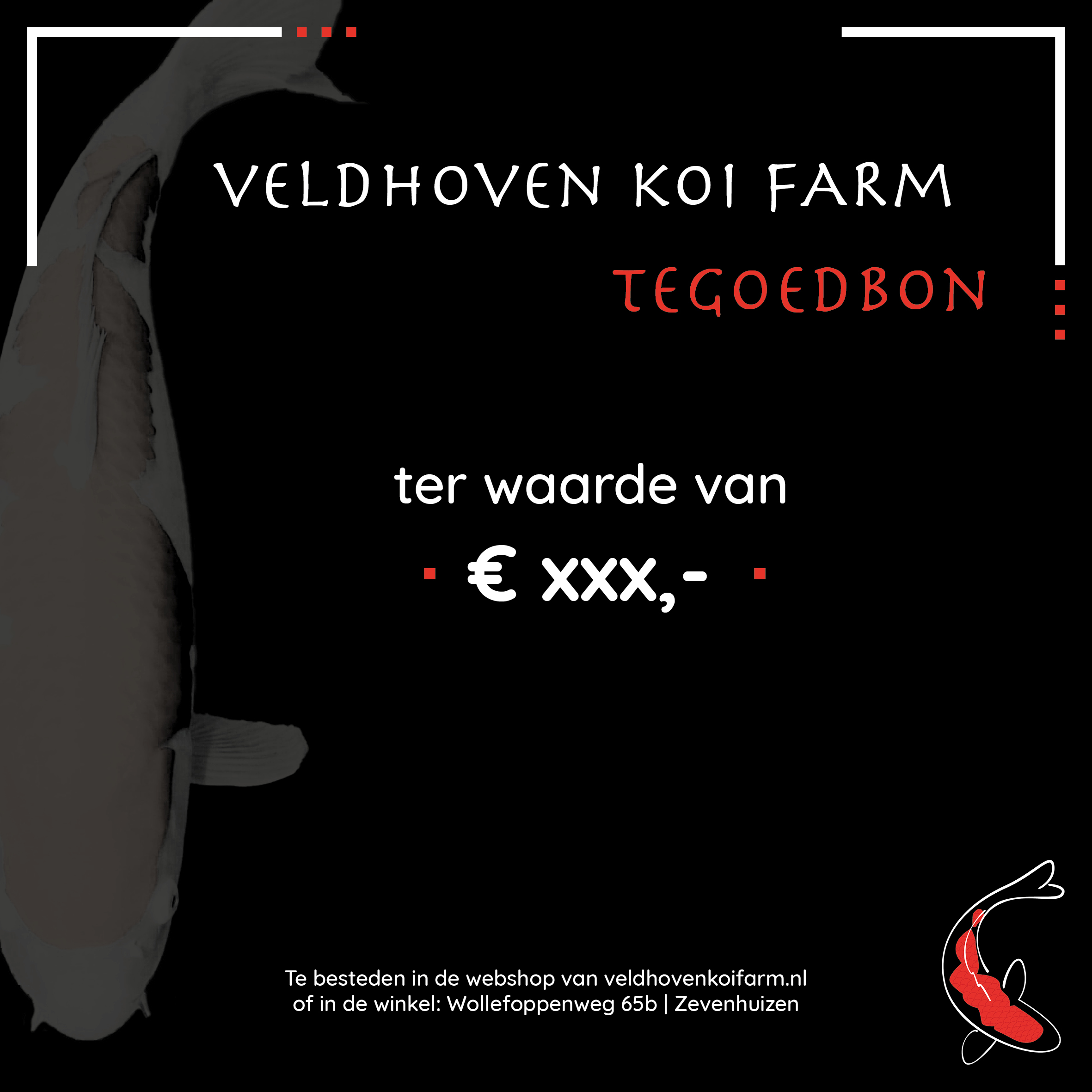 Koop nu een digitale Veldhoven Koi Farm tegoedbon en verras jouw dierbaren tijdens de feestdagen met een waardebon te besteden in de webshop of bij Veldhoven Koi Farm in Zevenhuizen.
